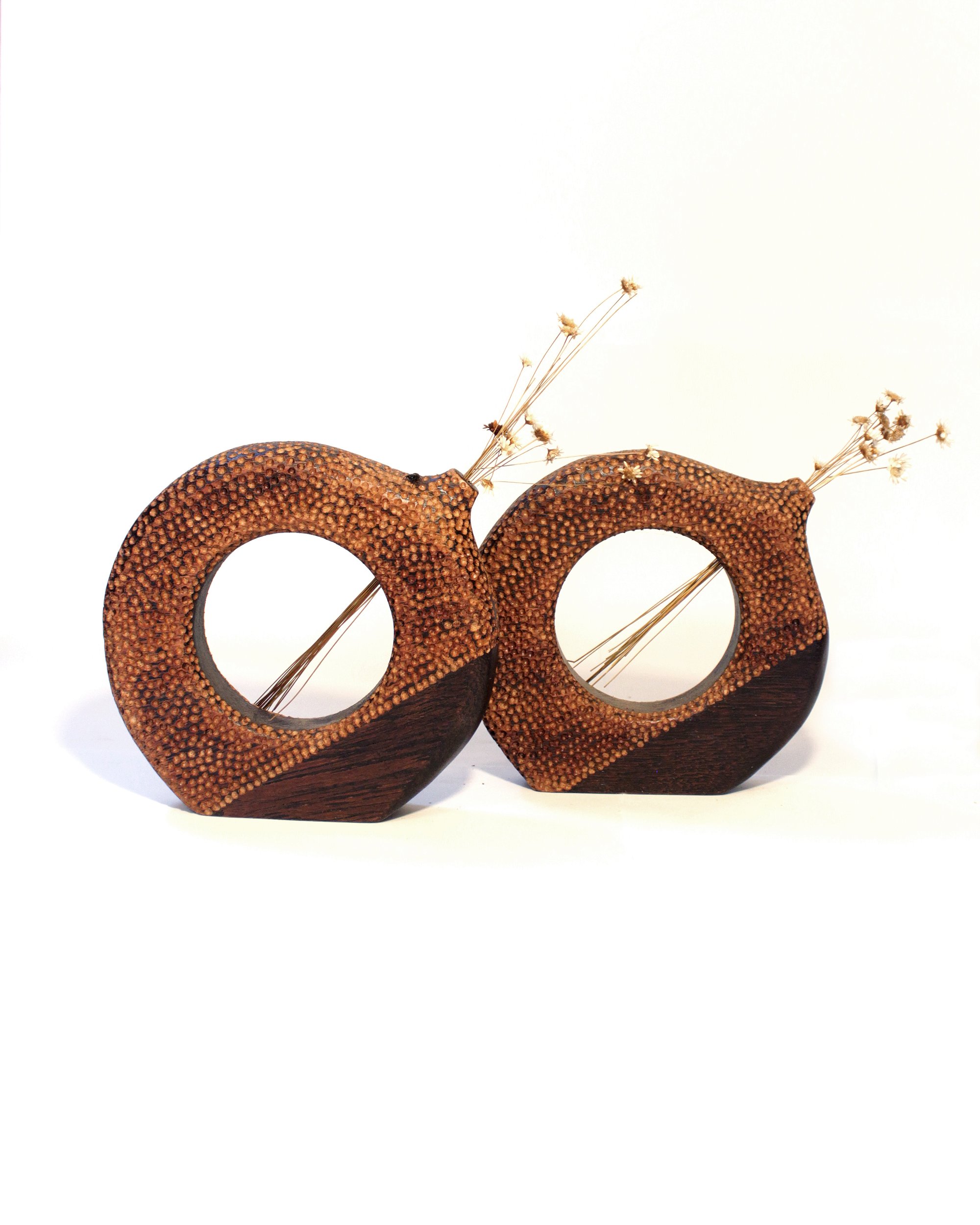 Os Vasos Arani combinam superfícies lisas e texturizadas, destacando o contraste entre acabamentos. O design inclui um vazado circular, criando leveza e equilíbrio na composição. Feitos em madeira de Angelim, são peças versáteis para diversos ambientes.