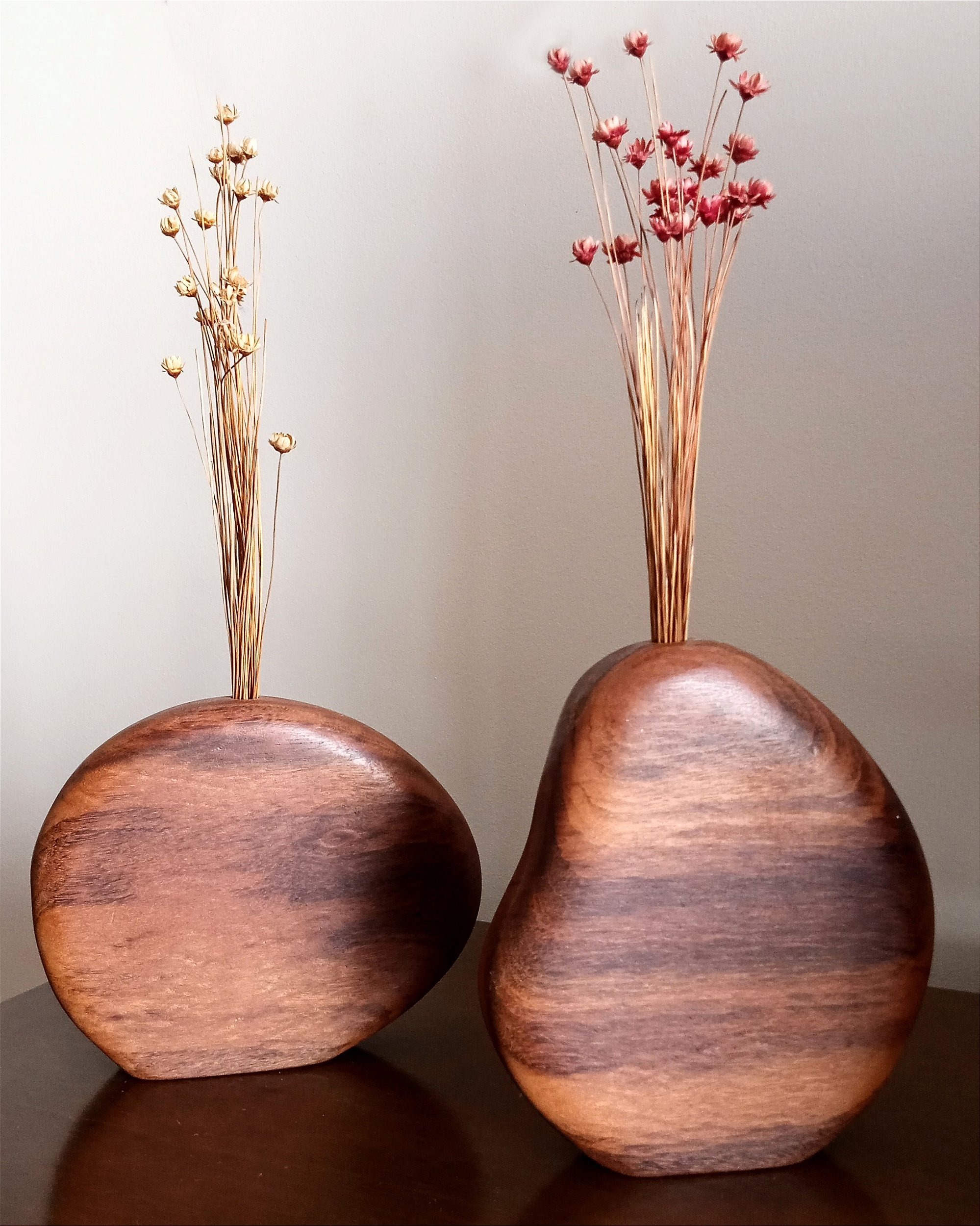 Feitos em maracatiara, os Vasos Karu trazem formas orgânicas que valorizam a textura e a cor única da madeira. Uma peça sofisticada que adiciona personalidade ao ambiente.